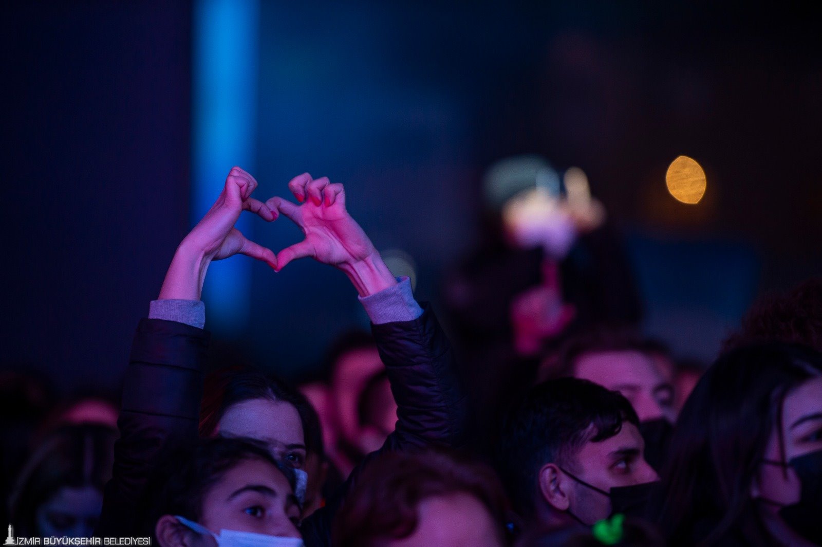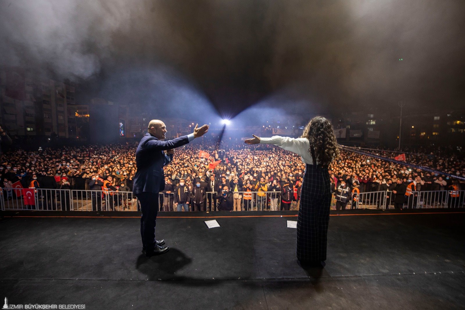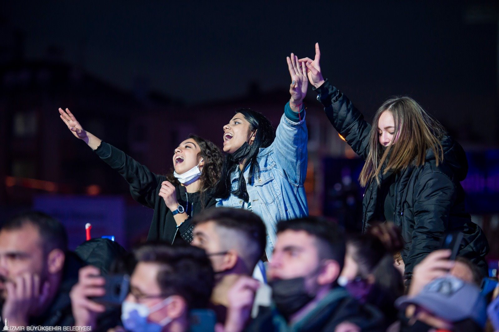 Soğuk havaya rağmen tören alanını terk etmeyen binlerce İzmirli, şarkılarını Bastık’la beraber söyledi.