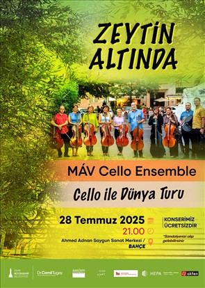 Ahmed Adnan Saygun Sanat Merkezi bahçesindeki zeytin ağacı altında gerçekleştirilen ve büyük ilgi gören “Zeytin Altında” konserlerinin bu yılki ilk konuğu MAV Cello Ensemble olacak. 28 Temmuz Pazartesi saat 21.00’de ücretsiz düzenlenecek konseri dinlemek isteyen İzmirliler, sandalyeleriyle birlikte alana giriş yapabiliyor.