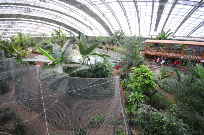 Tamamı kapalı 2345 m2 merkezde, özel ısıtma ve nemlendirme sağlanarak tropik yağmur ormanlarının koşulları oluşturulmuştur.