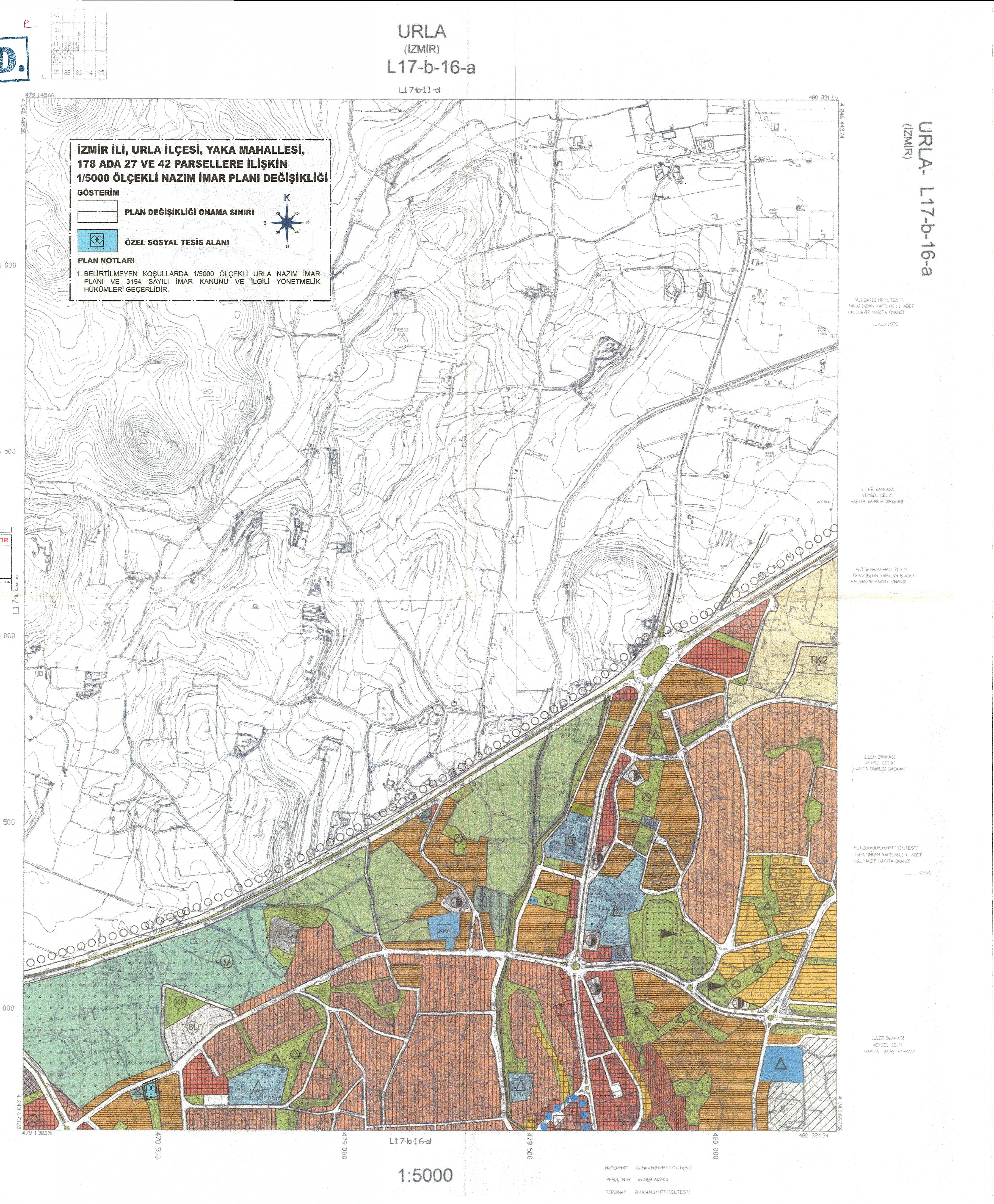 URLA İLÇESI, YAKA MAHALLESI, YÜRÜRLÜKTEKI NAZIM İMAR PLANINDA "KÜLTÜREL TESISLER ALANI" KULLANIM KARARINDA KALAN, 178 ADA, 27 VE 42 PARSELLERIN "ÖZEL SOSYAL TESIS ALANI" OLARAK BELIRLENMESINE ILIŞKIN HAZIRLANAN NİP:351088118 PLAN IŞLEM NUMARALI 1/5000 ÖLÇEKLI NAZIM İMAR PLANI DEĞIŞIKLIĞI, İZMIR BÜYÜKŞEHIR BELEDIYE MECLISIMIZIN 14.02.2025 TARIH VE 04.186 SAYILI KARARI ILE UYGUN GÖRÜLEREK BELEDIYE BAŞKANLIĞIMIZCA 21.04.2025 TARIHINDE ONAYLANMIŞ OLUP VE AYNI TARIHLI 2497111 SAYILI YAZIMIZ ILE KURUMLARA DAĞITIMI YAPILMIŞTIR. E:2497111