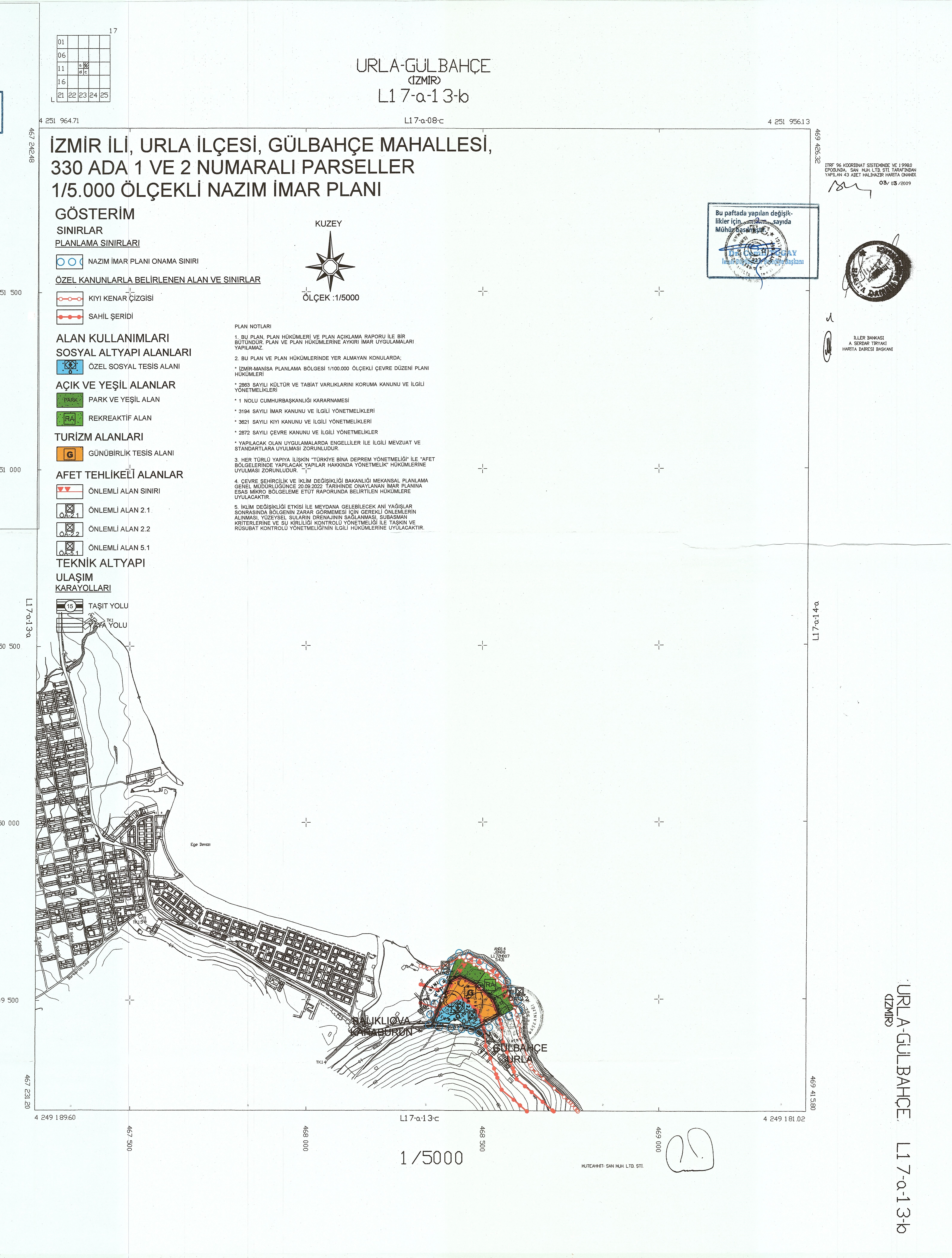 URLA İLÇESI, GÜLBAHÇE MAHALLESI, 330 ADA, 1 VE 2 PARSELLERIN ÖZEL SOSYAL TESIS ALANI, GÜNÜBIRLIK TESIS ALANI, PARK VE YEŞIL ALAN, REKREAKTIF ALAN VE TAŞIT YOLU OLARAK BELIRLENMESINE YÖNELIK PLAN MÜELLIFINCE HAZIRLANARAK SUNULAN 1/5000 ÖLÇEKLI NAZIM İMAR PLANI E:2571066