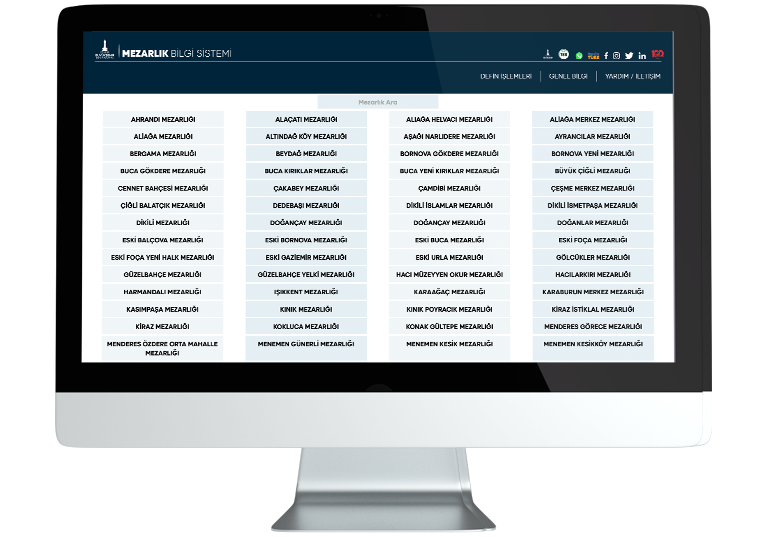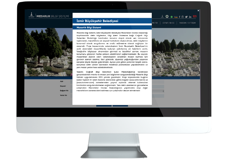 Mezarlık Bilgi Sistemi, İzmir Büyükşehir Belediyesi Mezarlıklar Dairesi Başkanlığı kayıtlarındaki defin bilgilerinin, Harita ve CBS Dairesine bağlı Coğrafi Bilgi Sistemleri Müdürlüğü tarafından konuma dayalı olarak veri tabanında toplanarak, mezarlıklara ait sayısal haritaların oluşturulması, defin bilgilerinin konumsal olarak sorgulanma ve analiz edilmesine olanak sağlayan bir sistemdir. Proje kapsamında vatandaşların İzmir Büyükşehir Belediyesi’nin yetki alanındaki mezarlıklarda bulunan yakınlarına ait kabirlerin yerini, fotoğrafını bilgisayar ekranından görmesi ve istedikleri zaman, mezarın konumunu gösteren harita çıktısını alabilmeleri sağlanmaktadır. Bu sayede mezarlıkları ziyaret eden vatandaşların aradıkları mezarı bulması için gereken zaman azalmış, özel günlerde, ziyaretçi çokluğundan yaşanan karışıklık büyük ölçüde giderilmiştir. Ayrıca yeni gömü yerlerinin tespiti adına, konumsal defin verileri üzerinden mekânsal planlamalar yapılabilmekte ve yeni mezar yerleri tesis edilebilmektedir.