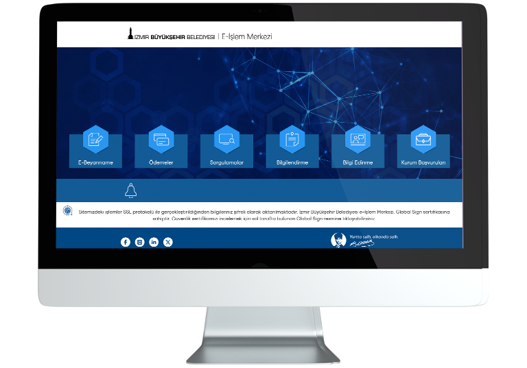 Vatandaşlarımızın ödemelerini gerçekleştirebildiği, ilan reklam ve yangın sigorta beyanlarını verebildikleri, itfaiye uygunluk raporu başvurusu yapabildikleri, mezarlık bilgi sistemine ve altyapı bilgi sistemine ulaşabildikleri WEB sitesi ekranımızdır.