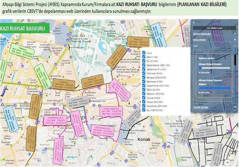 Tüm altyapı kurumlarınca talep edilen kazı ruhsatı belgelendirilmesine ait çalışmaların sistematik olarak yürütülmesi, takibi ve kontrolü aşamaları Altyapı Bilgi Sistemi ile sağlanmaktadır. Altyapı yatırımlarının Yıllık Yatırım Programlarına uygun olarak koordinasyon içerisinde yürütülmesi, tüm kazı yapılan ve yapılacak olan sokakların konumsal olarak kayıt altına alınması, kaçak kazıların önlenerek yatırım yararlarının üst düzeyde tutulması, ulusal kaynak israfının ve zaman kaybının azaltarak sistem için gerekli bilgilerin otomasyon içerisinde toplanması, güncel tutulması ve paydaşların kullanımına açılması gerçekleştirilerek 2007 yılından itibaren ruhsatlandırılan kazı bilgilerinin Coğrafi Bilgi Sistemi Veri Tabanından depolanması sağlanmaktadır.